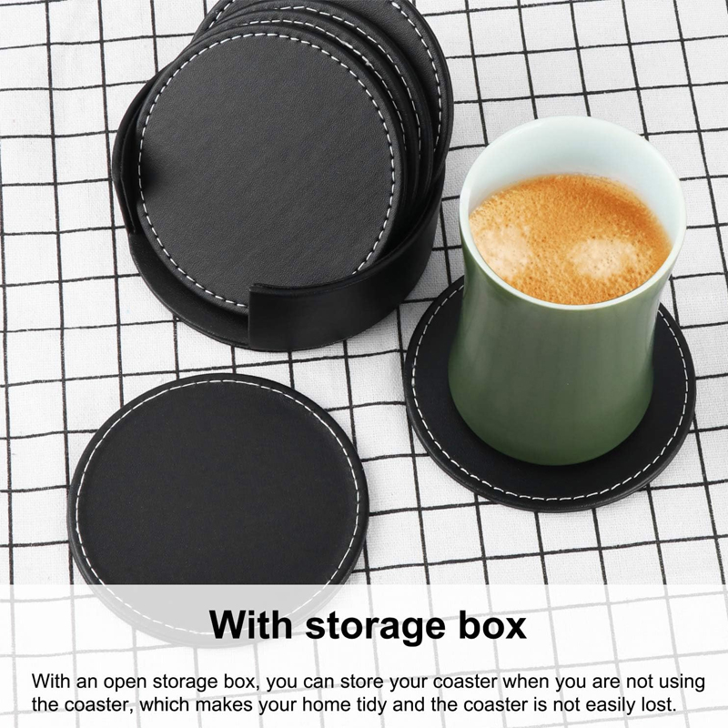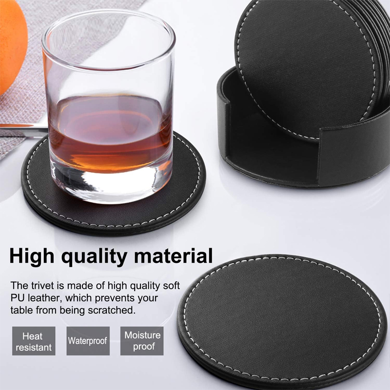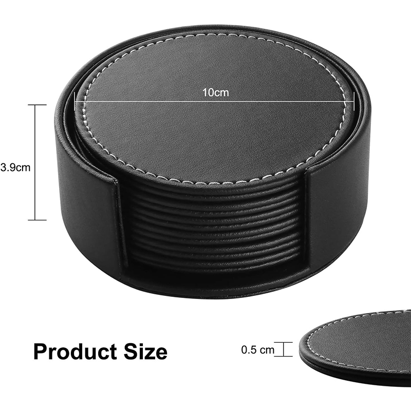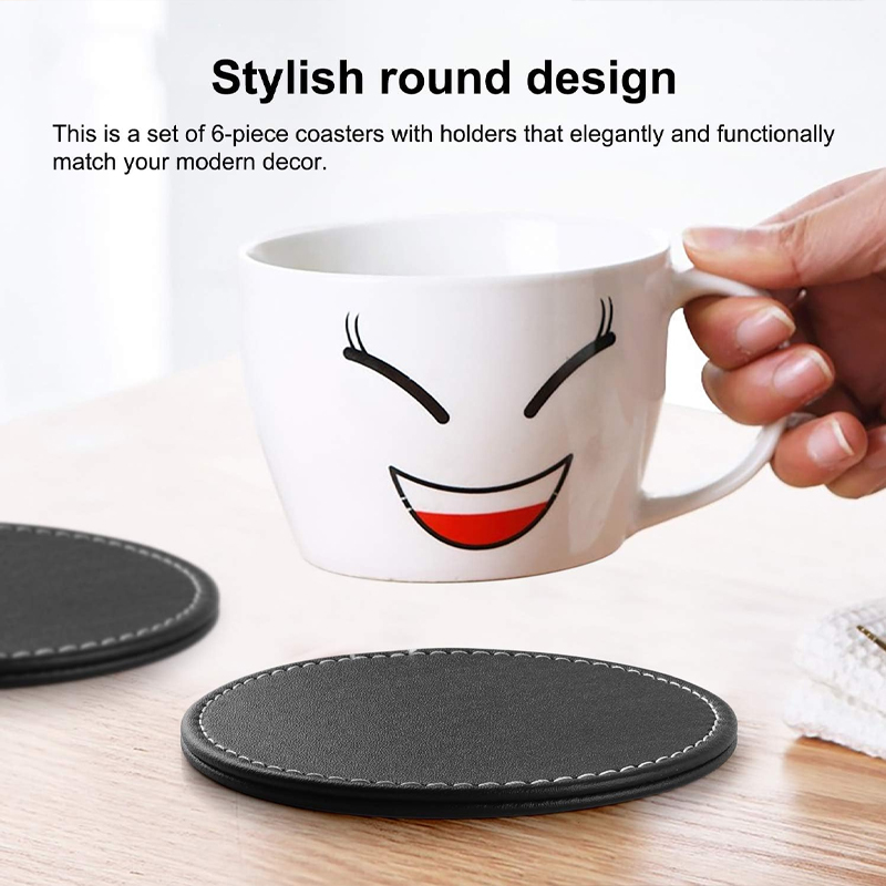 Includes 6 coasters + matching holder. Made from durable PU leather with a non-slip backing. Perfect for glasses, coffee mugs, or bottles.